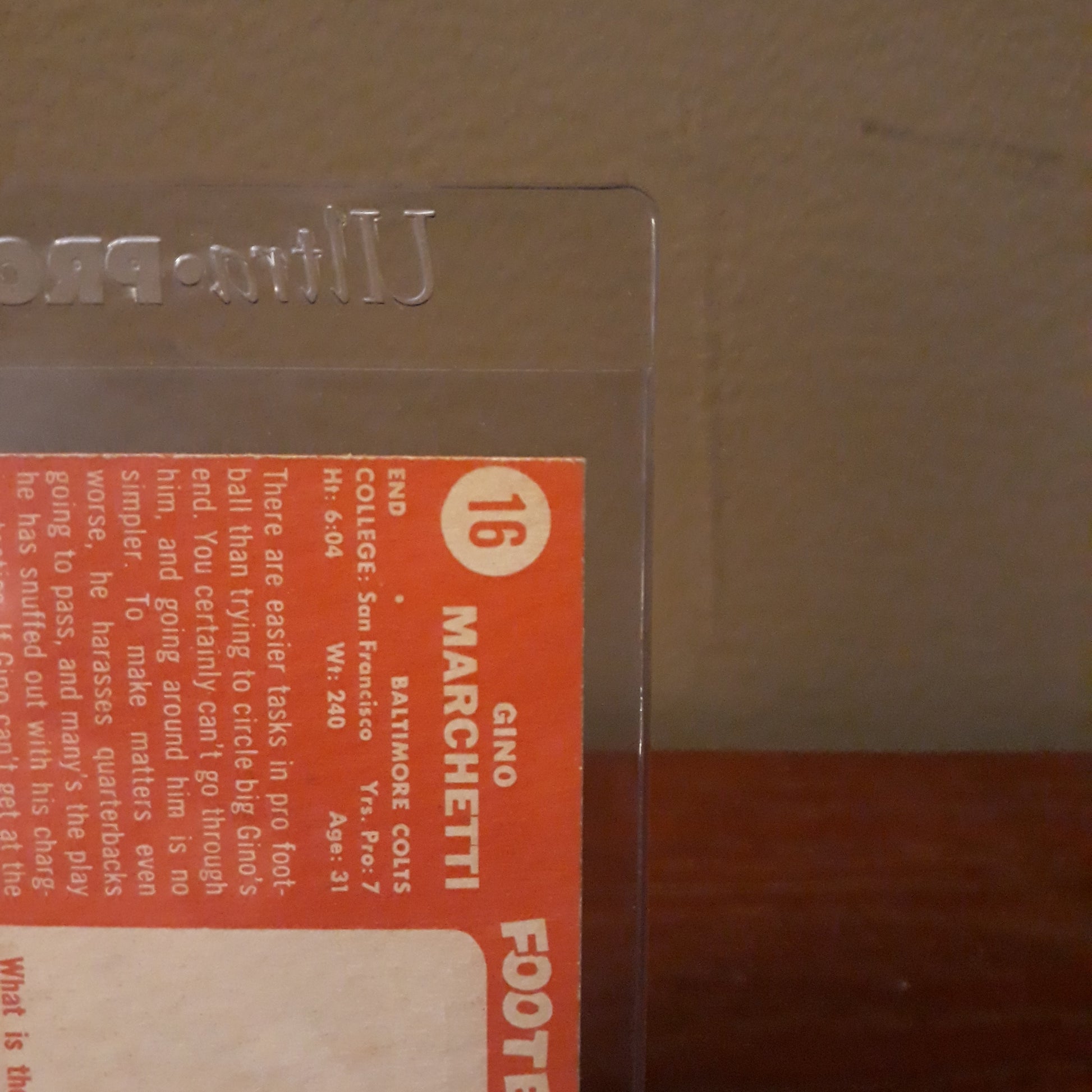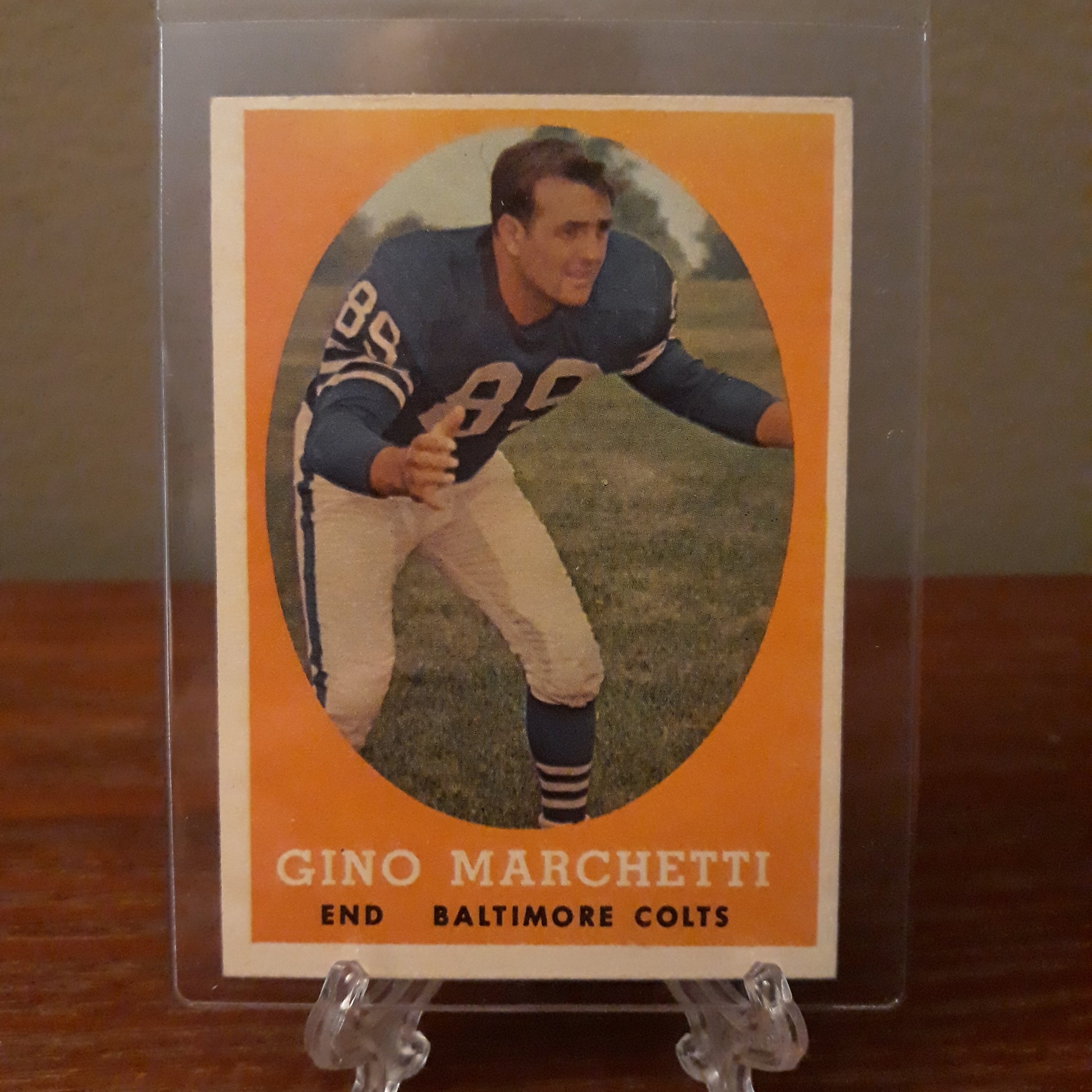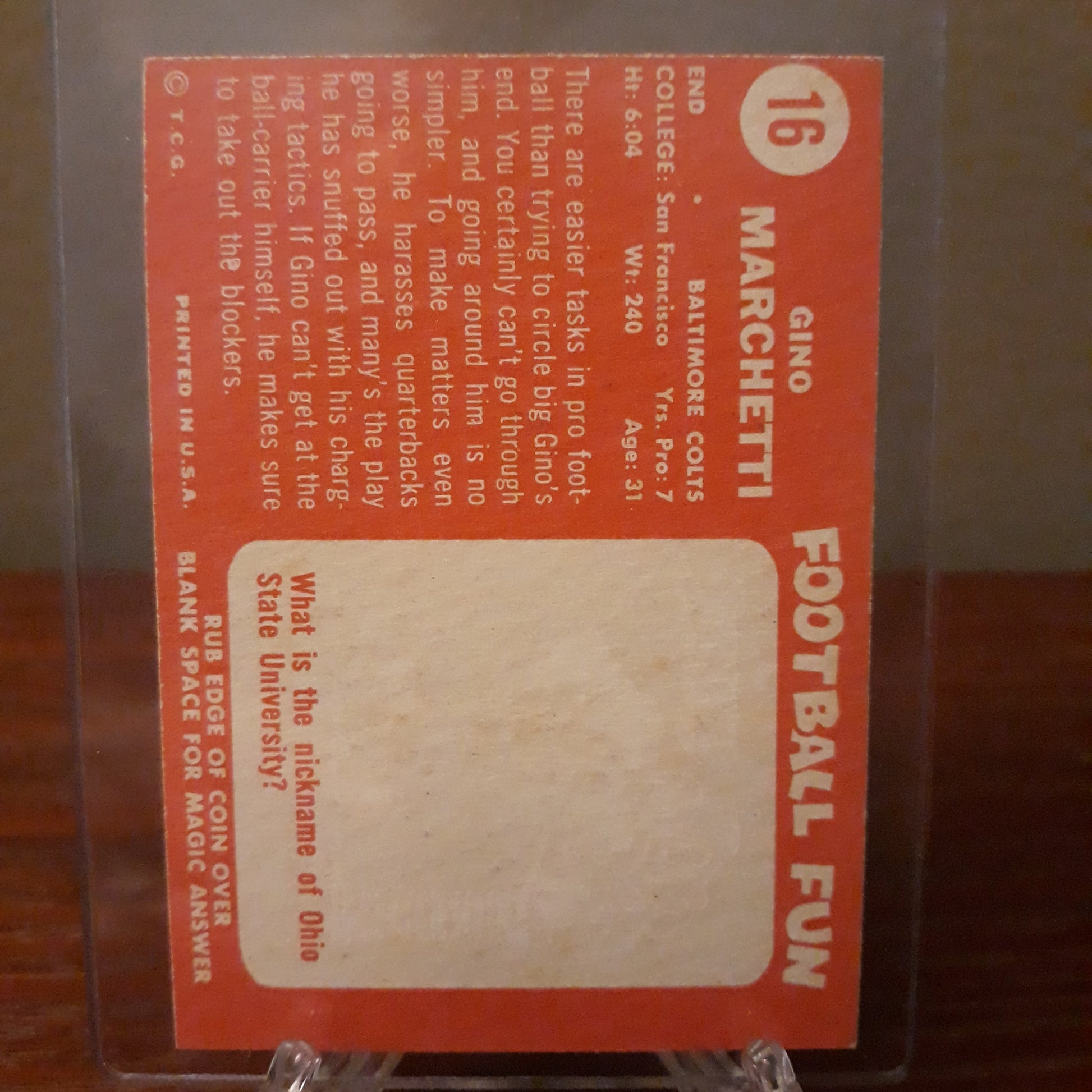 1958 Topps Football Gino Marchetti #16 (VG-EX). Card comes in a semi-rigid card holder ready for grading.