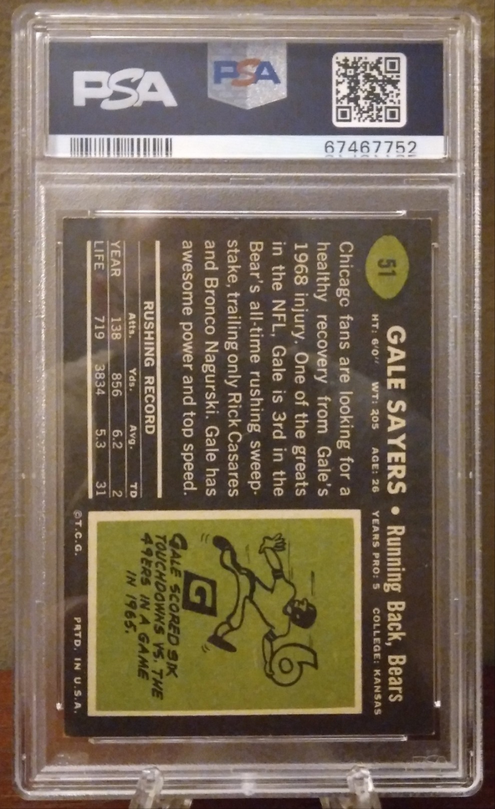 1969 Topps Gale Sayers #51 PSA Grade EX-MT 6. Freshly graded from PSA. Check out all our vintage football card collections at Mike n' Mandy's Corner, LLC.