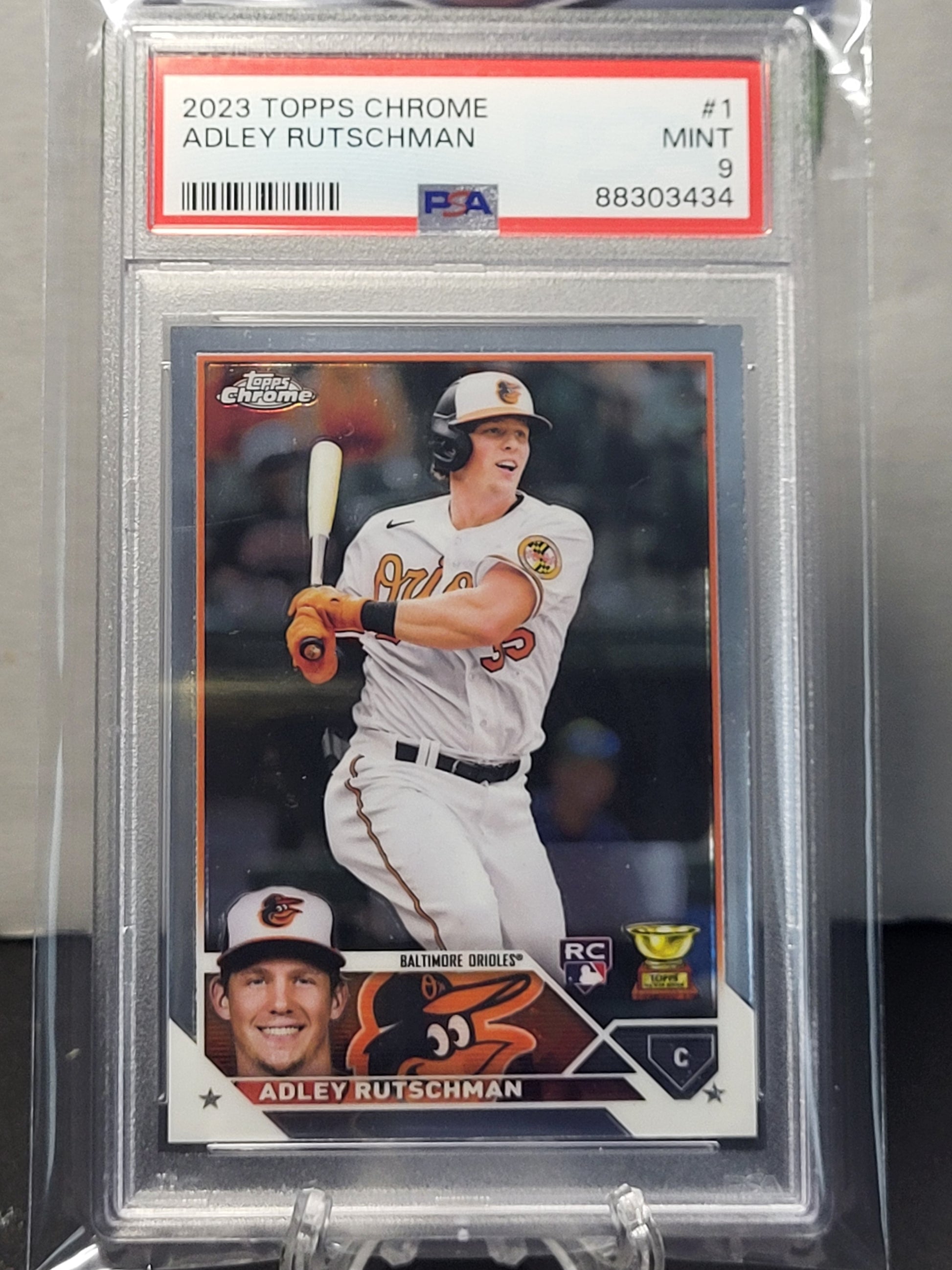 Expertly graded 2023 Topps Chrome 1 Adley Rutschman RC PSA Mint 9 for superb quality and investment potential. Rare rookie card from rising baseball star with a professional and objective evaluation. Secure your investment with this top-tier collectible.